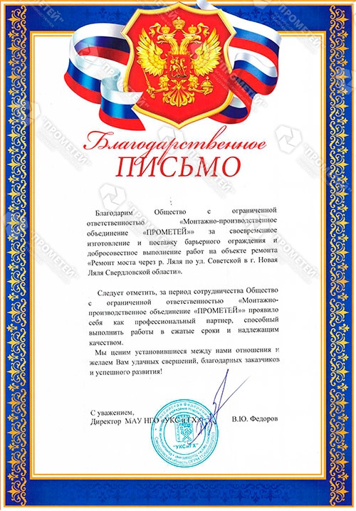 Силами МПО "Прометей" проведена поставка и монтаж барьерного мостового ограждения в г. Нова Ляля. Контролем сроков сдачи объекта и ходом работ занимался лично глава Новолялинского городского округа-Сергей Бондаренко.